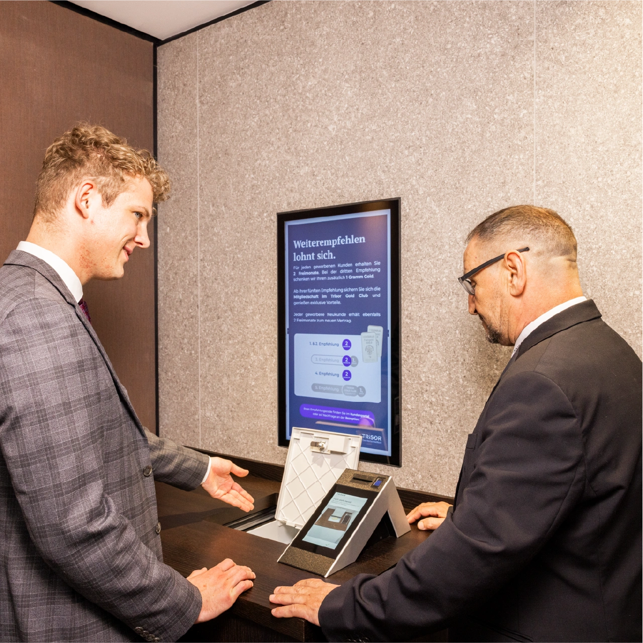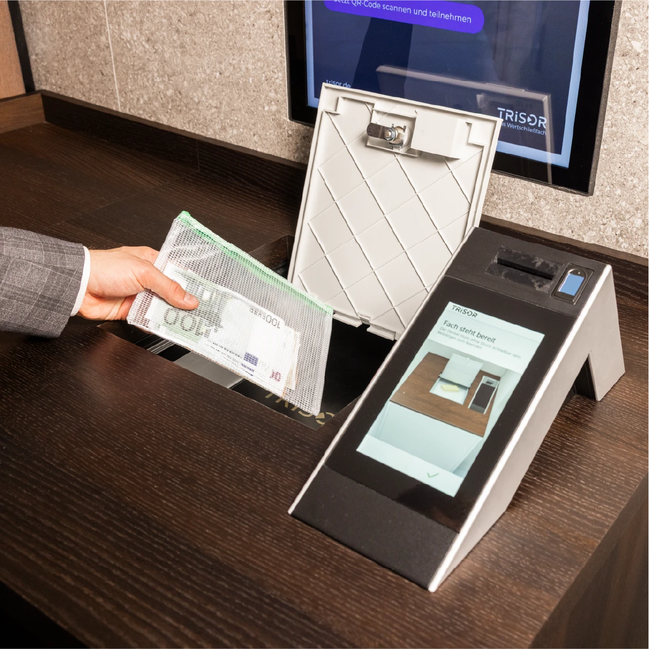 Confidentiality and comfort are essential for professional business operations. Our discreet customer cabins provide secure, spacious areas where you can safely store and handle business documents, valuables, or sensitive data. Even larger items, such as money counting machines, fit comfortably here. At many locations, we provide these devices upon request – ideal for efficient and confidential on-site processes.Confidentiality and comfort are essential for professional business operations. Our discreet customer booths offer protected, spacious areas where you can securely store and work on business documents, valuables, or sensitive data. Even larger items, such as banknote counters, fit comfortably. At many locations, we can provide these devices on request – ideal for efficient and confidential processes on site.