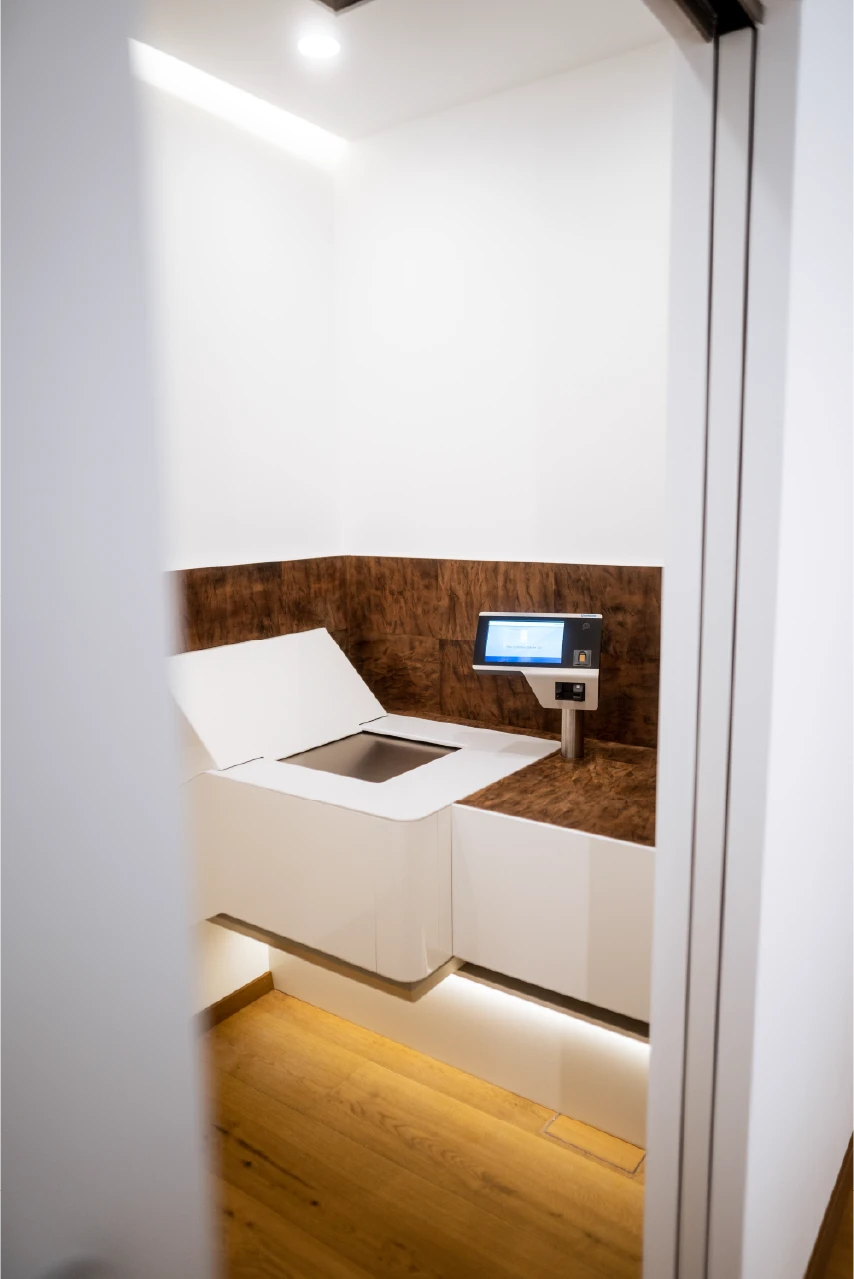 - Za pomocą osobistego PIN-u i karty wchodzisz do jednej z trzech prywatnych kabin.