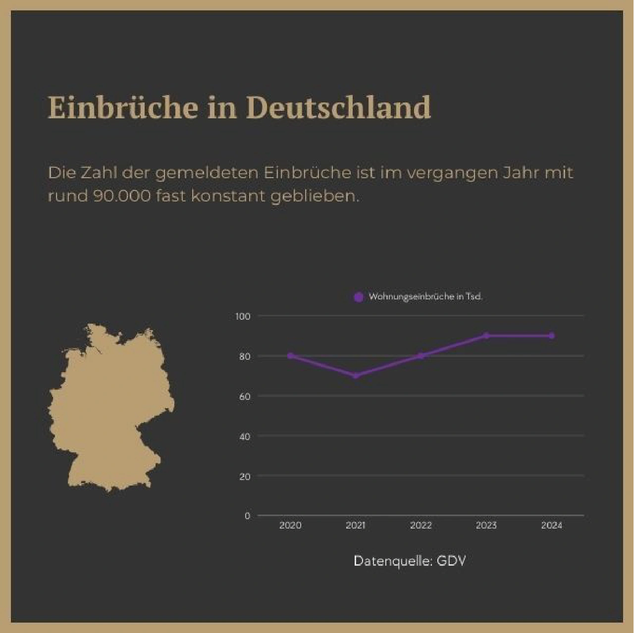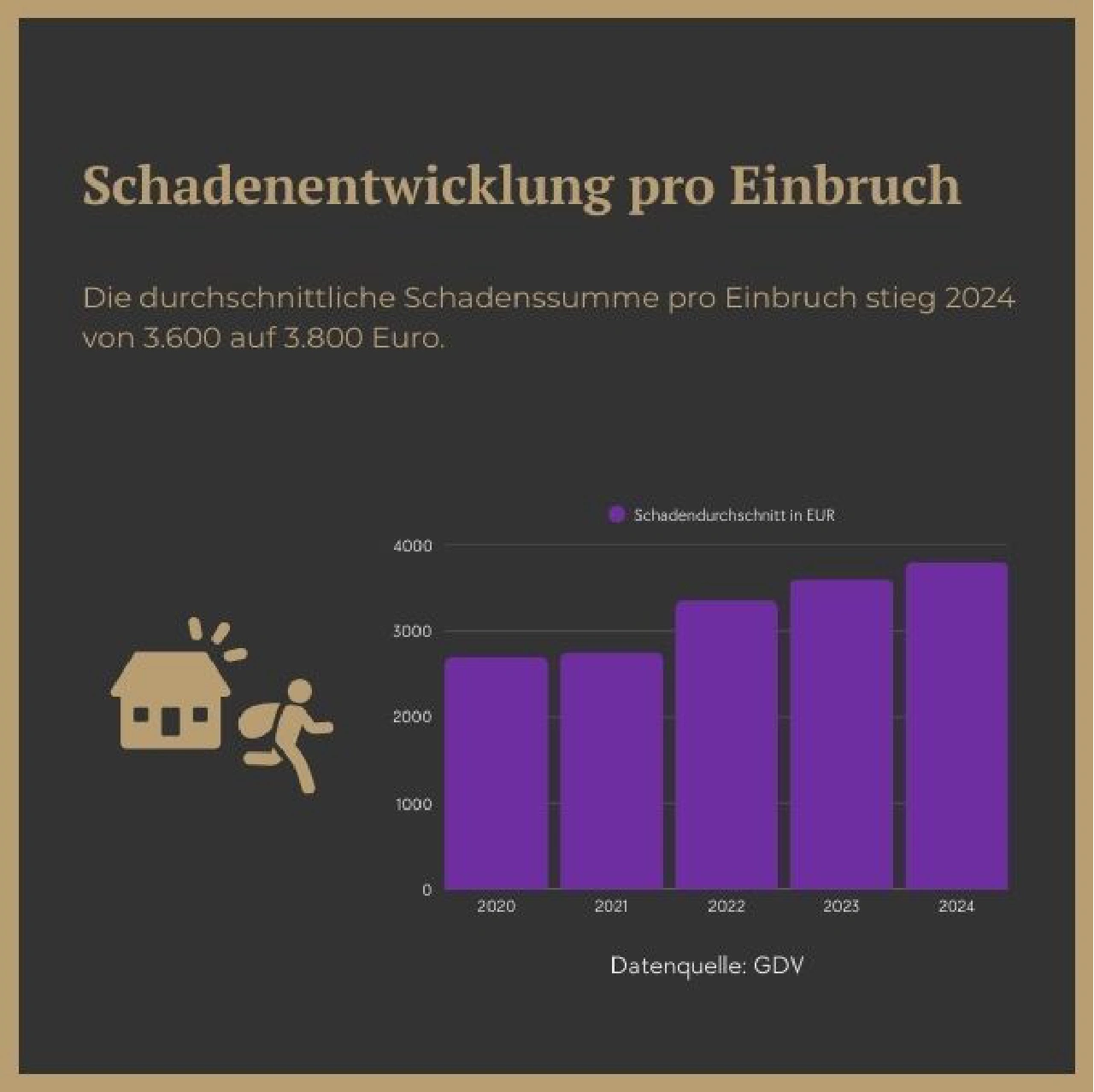 Równolegle z utrzymującą się wysoką liczbą przypadków rośnie średnia wartość szkody na jedno włamanie: według GDV wzrosła ona z ok. 2.900 € (2020) do 3.800 € (2024). Łączne wypłaty odszkodowań od ubezpieczycieli osiągnęły w 2024 roku 350 mln €. Powodem jest to, że złodzieje celowo kradną łatwo zbywalne przedmioty, takie jak smartfony, aparaty fotograficzne, laptopy – a coraz częściej także drogie zegarki lub metale szlachetne. Poza stratami finansowymi istotne są również skutki niematerialne: zniszczone drzwi, wybite okna i poczucie braku bezpieczeństwa we własnym domu.